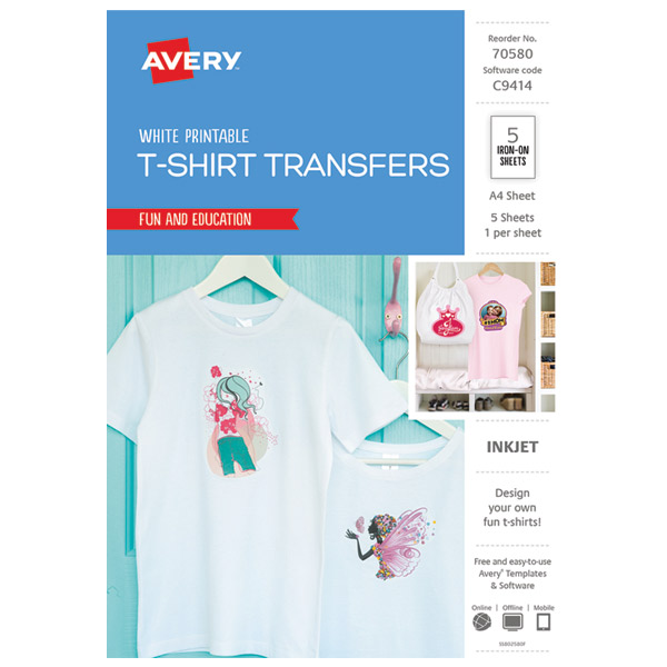 AVERY 70580 C9414 INSPIRED T-SHIRT TRANSFER A4 WHITE PACK 5