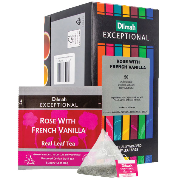 DILMAH EXCEPTIONAL TEA BAGS ROSE WITH FRENCH VANILLA FOIL ENVELOPED BOX 50