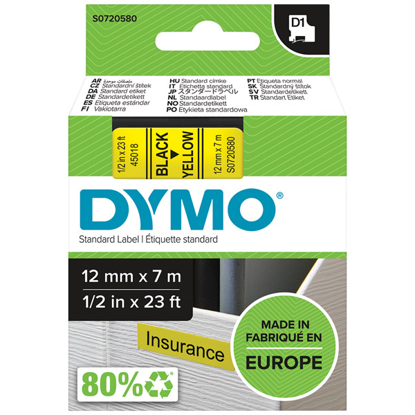 DYMO 45018 D1 LABELLING TAPE 12MM X 7M BLACK ON YELLOW