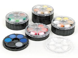 Compact and convenient water watercolour discs twist together for easy use in both classroom and outdoor work. Colours are highly pigmented, a favourite product amongst art teachers both secondary and primary