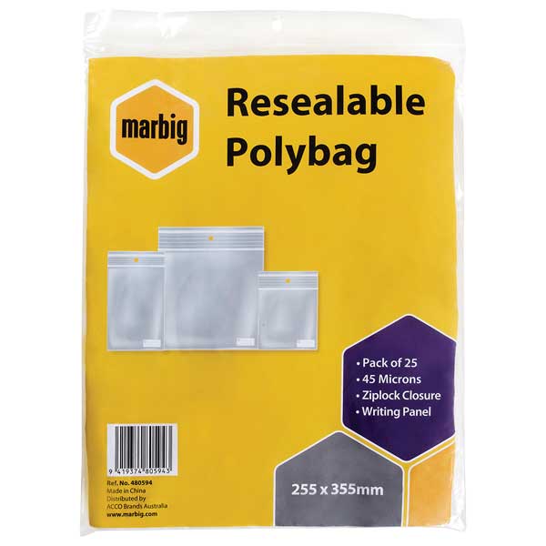 MARBIG PLASTIC BAG RESEALABLE 45MU W255 X L355MM CLEAR WITH WRITING PANEL PACK 25