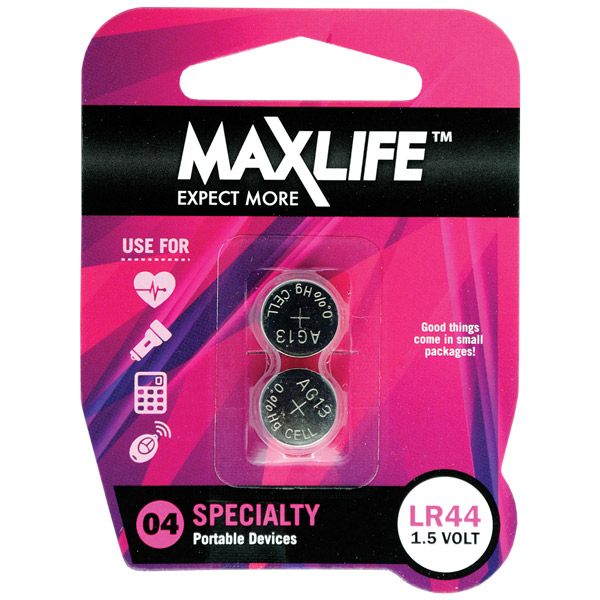 MAXLIFE BATTERY ALKALINE BUTTON CELL LR44 PACK 2