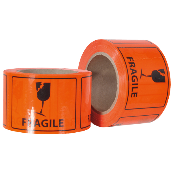 PRINTED LABEL POMONA FRAGILE 72 X 100MM BLACK ON FLUORO ORANGE 660/ROLL